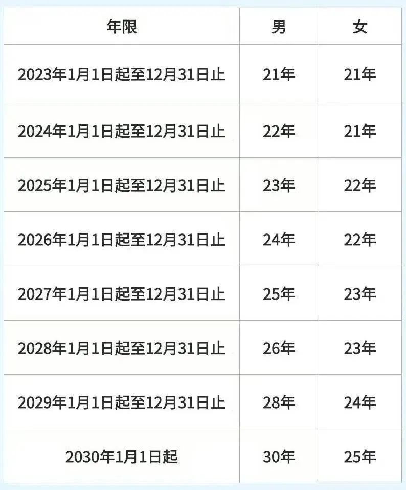 职工医保累计缴费年限实行逐年调整,累计最低缴费年限从2023年1月1日起至2030年1月1日逐步统一为男职工30年,女职工25年。