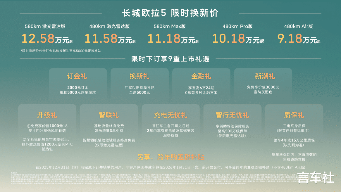 【中国·保定】2025年12月16日——今日,长城汽车欧拉品牌全新A级纯电SUV——长城欧拉5正式上市。新车共推出5款配置,建议零售价区间为 9.98万至13.38万元,限时换新价9.18万元起(限时换新价包含“订金礼”和“换新礼”至高5000元以旧换新补贴)。为回馈广大用户的热爱与支持,即日起至2025年12月31日,用户下订并锁单即可尊享包含订金礼、换新礼、智行无忧礼在内的9重上市好礼,以及跨年购置税补贴(不含480km Air版)等丰厚购车权益。凭借诚意十足的价格权益与越级产品力,长城欧拉5致力于成为全球年轻用户的“严选搭子”。