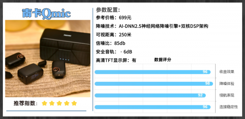 在专业级的领夹麦克风中,QMic全面优于同类标准,48kHz采样率+24Bit位深带来录音棚级音质,人声还原度高达98%以上,支持重度/轻度双档降噪与20档增益调节,并搭载三重防爆音抑制系统让爆音削减90%以上。双核DSP并行架构配合AI-DNN2.5神经网络降噪与WindSense2.0风噪识别,让复杂环境下依旧纯净稳定,鲸语Comm通信技术实现250米稳定收音,配置性能直接拉满,可以算得上是目前千元级领夹麦克风的巅峰之作。
