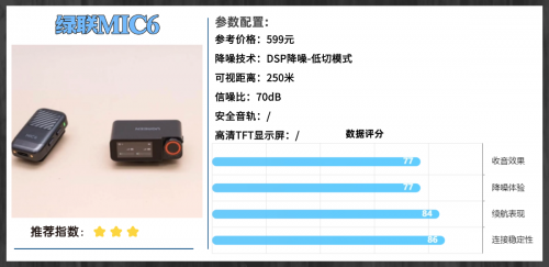 绿联MIC6以一拖二配置适配双人场景,27g发射器支持背夹与磁吸双固定,夹在衣领上稳固不晃,磁吸方式贴附西装内衬也隐蔽。接收器带1.05英寸彩屏,电量、增益等参数一目了然,冷靴卡口可直连相机,搭配MFi认证线,手机、电脑无缝衔接,配件收纳包能统装所有线材,外出很省心。