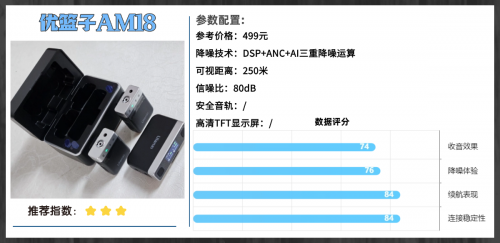优篮子AM18以一拖二配置适配双人创作,23g发射器质感扎实,金属领夹夹持力适中,静态拍摄时夹在衣领上稳固不晃。