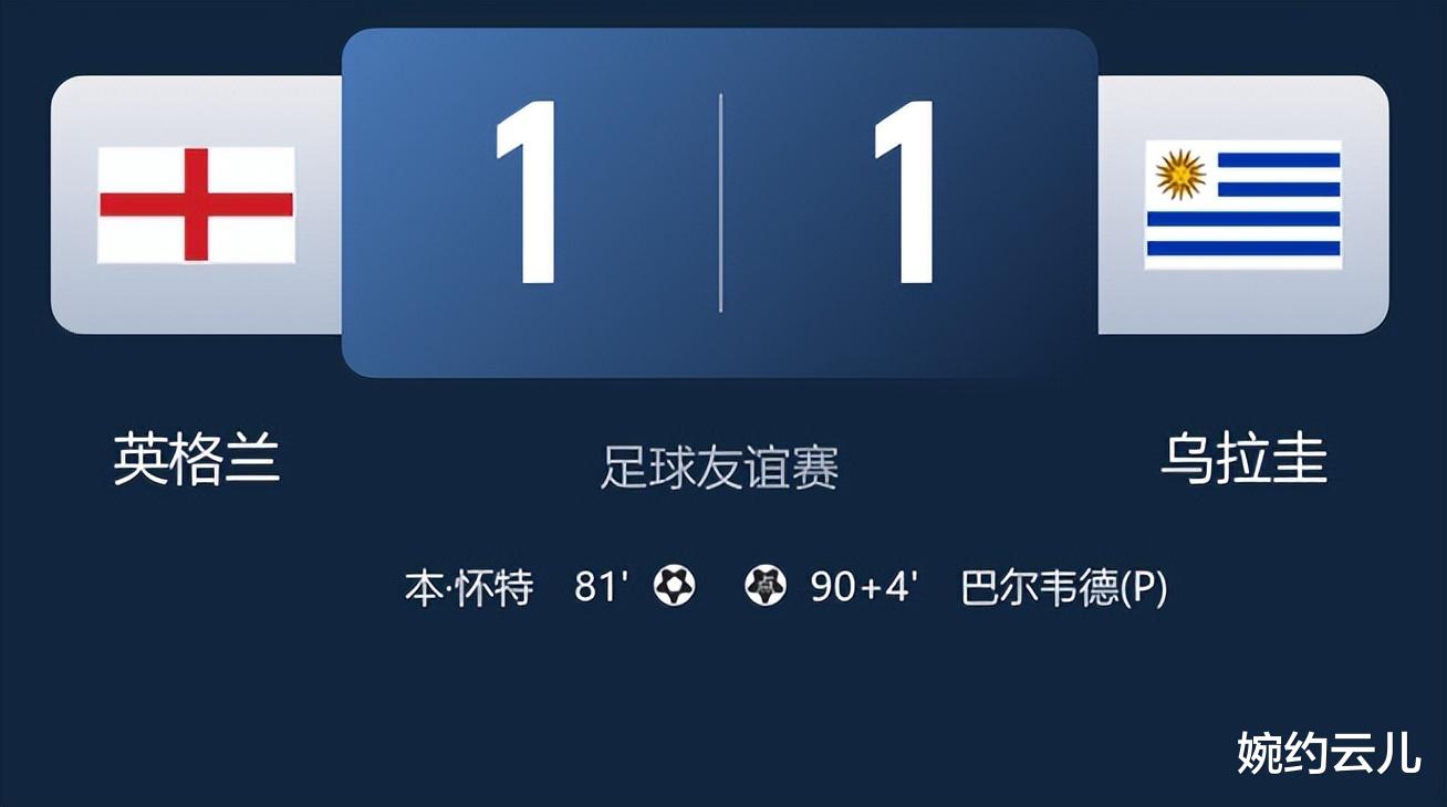 命运的反转来得猝不及防,比赛尾声阶段剧情再度改写。伤停补时第4分钟,乌拉圭发起最后攻势,进攻推进至英格兰禁区之内。本・怀特防守时不慎绊倒比尼亚斯,主裁判第一时间并未做出判罚,经过 VAR 介入复核后,裁判亲自回看录像改判点球,并向本・怀特出示黄牌警告。从破门功臣到犯规罪人,短短十余分钟本・怀特经历冰火两重天。关键时刻,巴尔韦德顶住压力站上点球点,冷静推射稳稳命中,将比分扳为 1-1 绝平全场。此后双方再无建树,整场比赛尘埃落定。