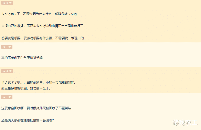 不过也有人发帖说了一堆原因说自己为什么要卡这个 bug,也说什么自己上线就送这个东西什么的,很多玩家直接在评论区中怼了回来,直言道卡 bug 就卡了,不要说因为什么什么,所以我才卡 bug,直视自己的欲望,不要将卡 bug 这种事情正当合理化就行了。确实很多时候卡 bug 需要技巧,而不是真的什么一进入到游戏就送的 bug 那种确实没有办法,但是要执行特定条件才能获取的装备,卡了就卡了无所谓的。