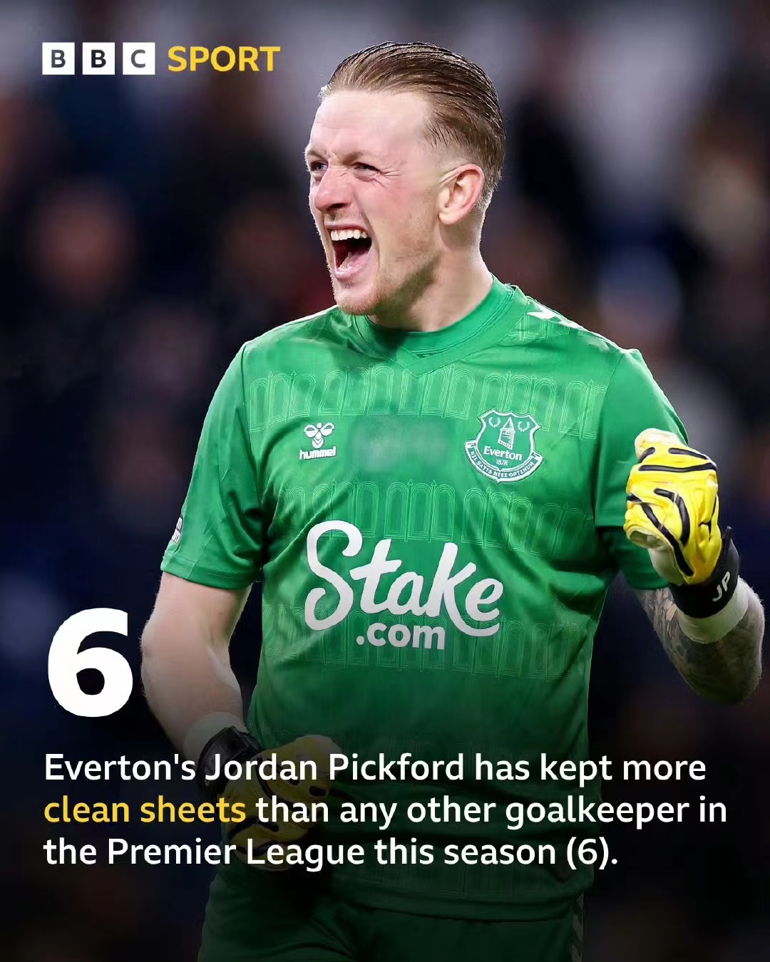 标题一:领跑金手套!埃弗顿门将皮克福德零封场次登顶英超