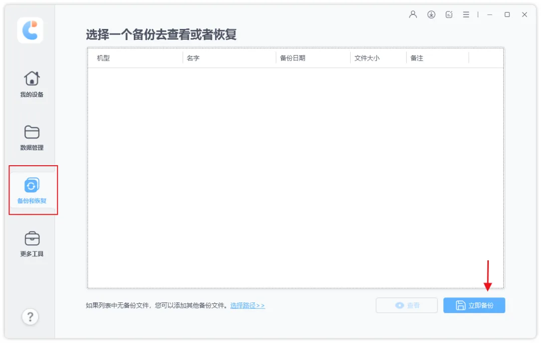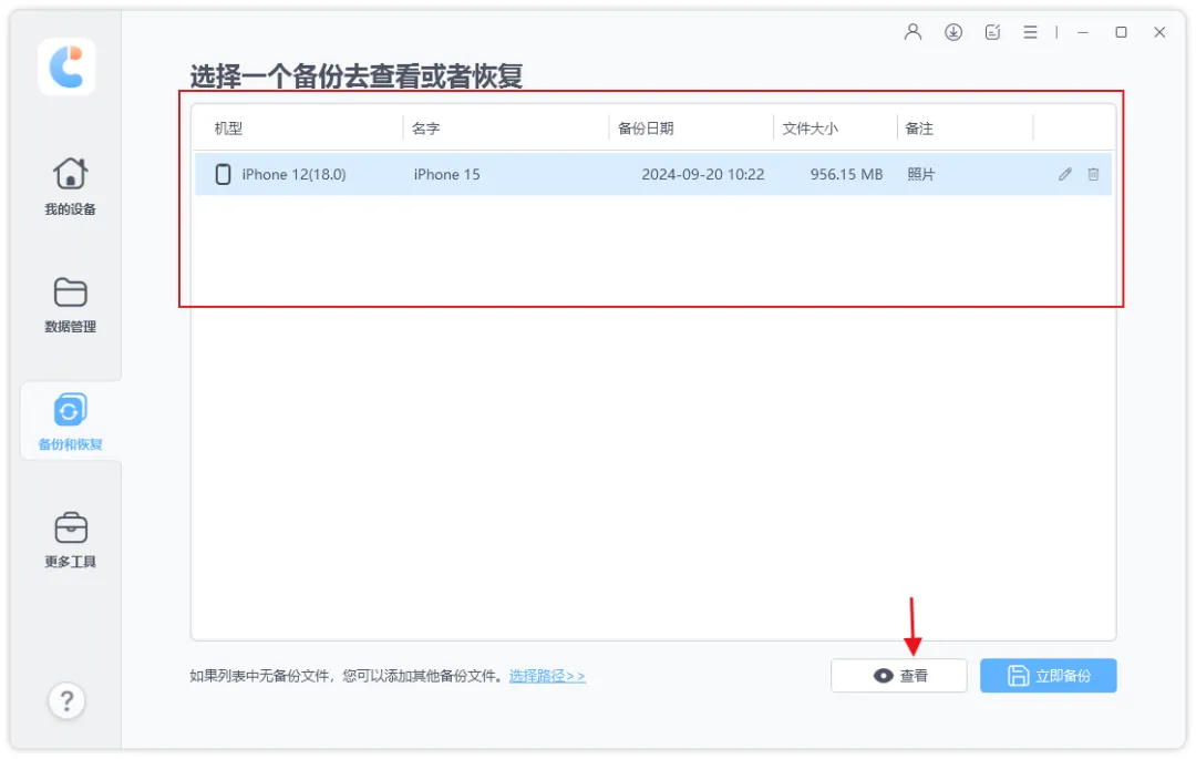 步骤3:备份完成后,断开旧iPhone的连接,连接新iPhone17,在查看备份区选择我们想要恢复的备份,然后点击“查看”,即可查看已备份的文件数据。