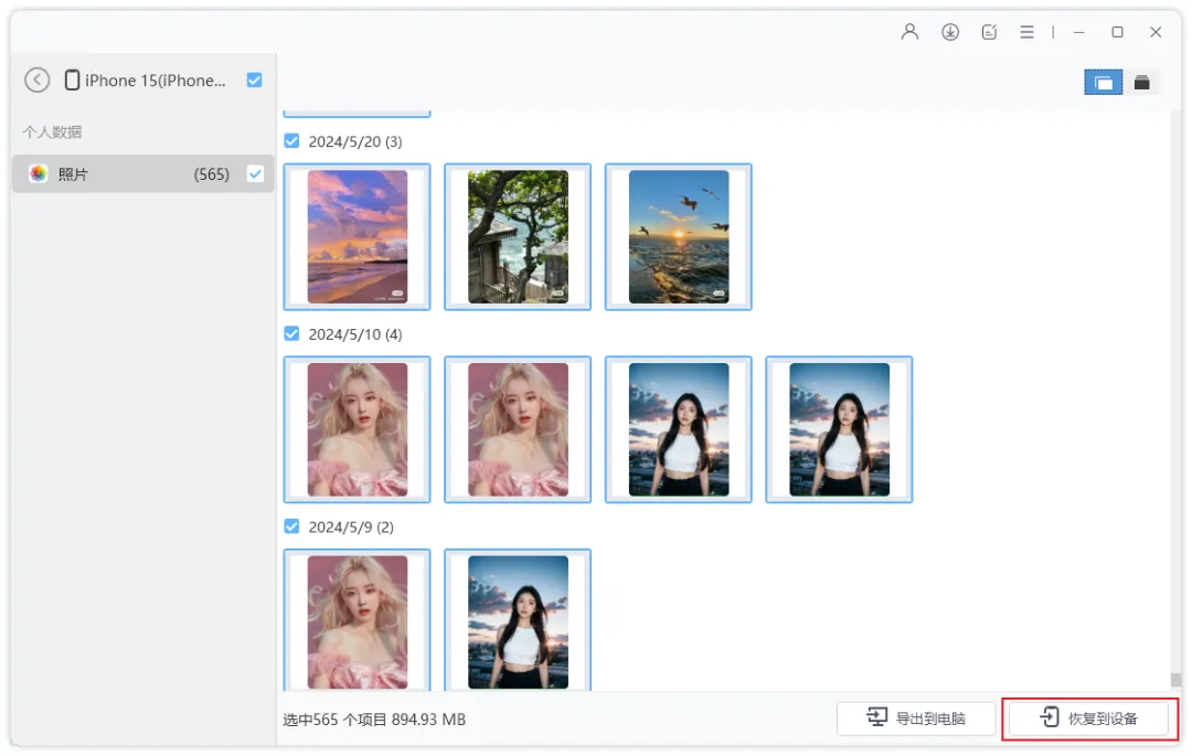 步骤4:所有备份数据按照数据类别显示,然后选择要恢复的数据,点击“恢复到设备”即可。