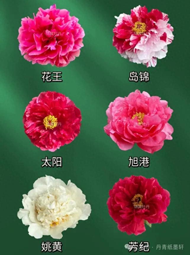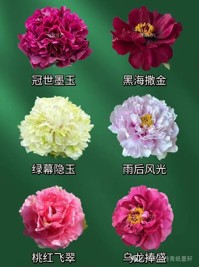 冠世墨玉 – 墨紫色,千层台阁,瓣质厚黑亮,为黑牡丹代表。墨润绝伦 – 黑紫红色,皇冠型,油润光泽,花期晚。乌金耀辉 – 黑紫色,千层台阁,瓣端有白丝,闪光。青龙卧墨池 – 黑紫色,皇冠型,中心有绿色瓣(青龙),名贵稀有。