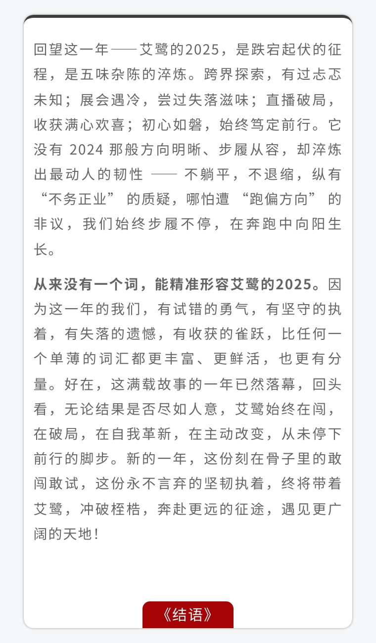 没有专业团队兜底,没有高端设备助力,那就凑齐手边可用之物,先行动再精进;没有专业主播的从容功底,没有熟记于心的成套话术,那就抛开套路,用最朴素的真诚,换取每一位观众的信任;没有成熟可照搬的直播流程,那就在一次次开播、一次次复盘里总结优化,让百场直播的沉淀,成就独属于艾鹭的直播模式