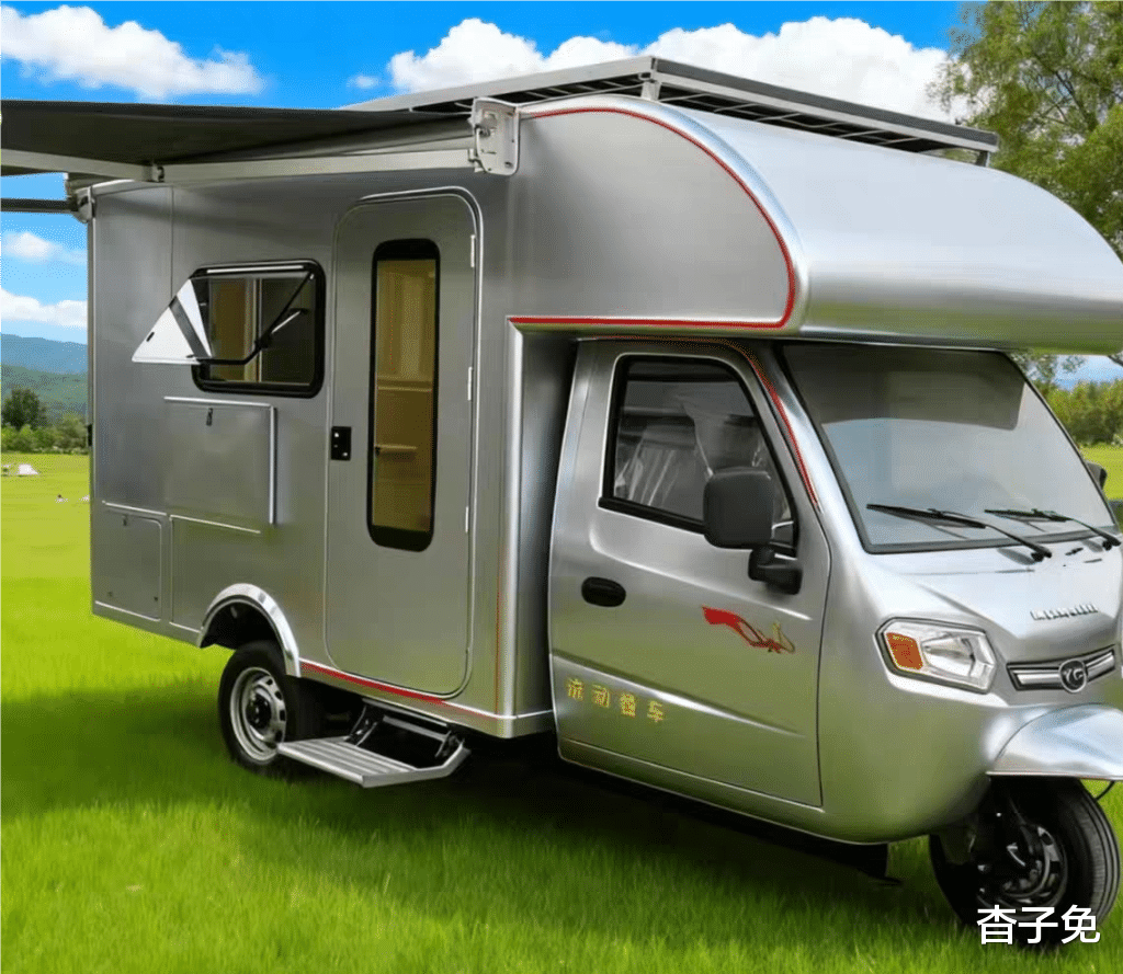 这是一辆电动三轮房车,大额头C型房车结构,封闭式驾驶室能够遮风挡雨,通身银色车漆,简洁靓丽上档次,箱体由铝合金打造,更轻更亮更个性;箱体两侧都开设了房窗,有利于室内通风和采光,箱门在右侧分别路边停车时上下车厢;右上配备了侧边帐,方便户外露营,车顶加装了太阳能板,有光就能发电;车尾下面还有增程器,有油就能边跑边发电,提供电力上的第三道保障;室内左侧是纵向单人床,上部有吊柜和车载冰箱,右侧是靠窗厨柜,上面可作为吧台使用,窗户上方还有驻车空调,不惧冬冷夏热;车尾是洗手间,解决了长途自驾游如厕和洗浴问题。三轮房车不止是经济实用,也可以做的高端大气上档次,一台不算贵的电动三轮房车就是一座移动的精致温暖小家。#三轮房车# #电动房车# #微型房车#