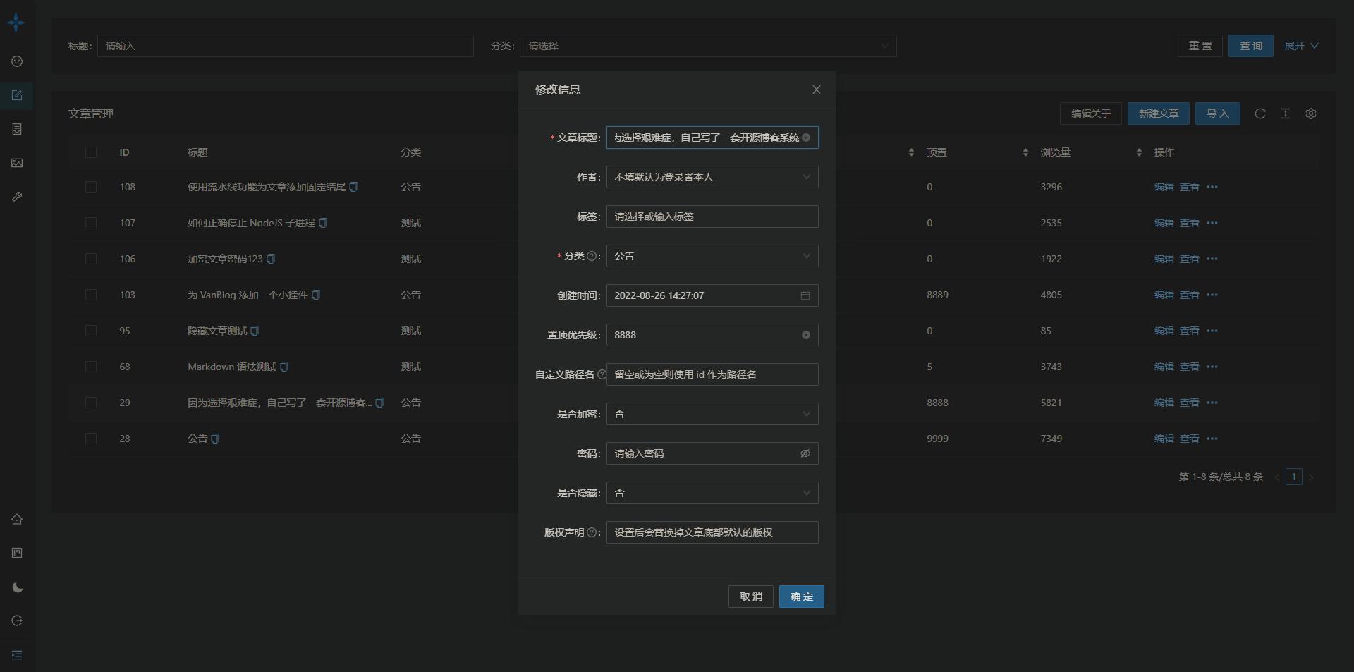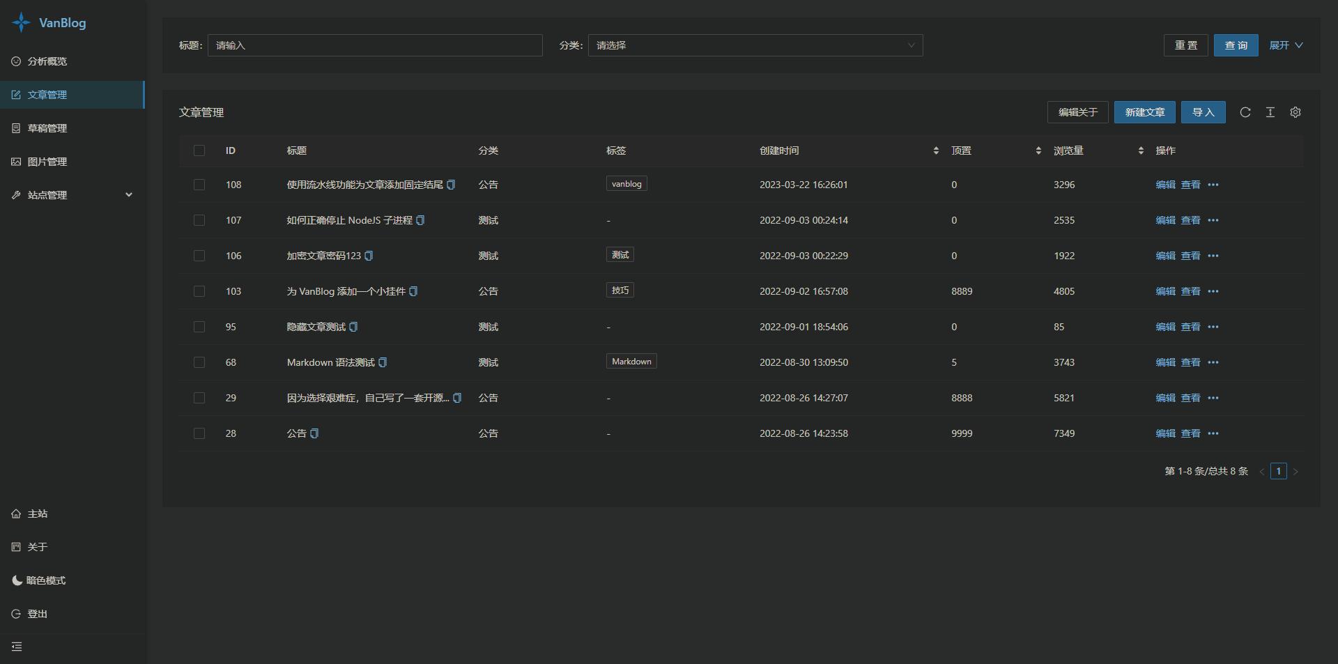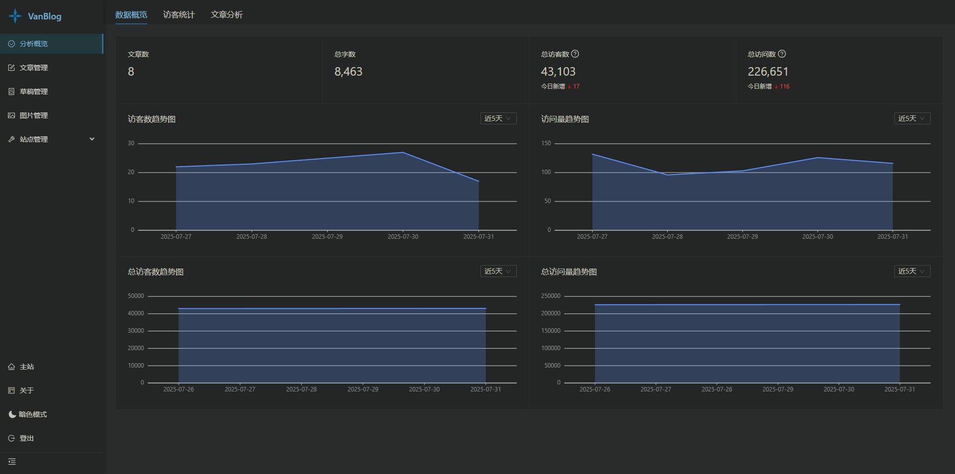 项目介绍VanBlog —— 一款简洁、实用、优雅的个人博客系统,内置了流量统计和图床,集成了评论系统,并支持全自动按需申请 HTTPS 证书、黑暗模式、移动端自适应等。
