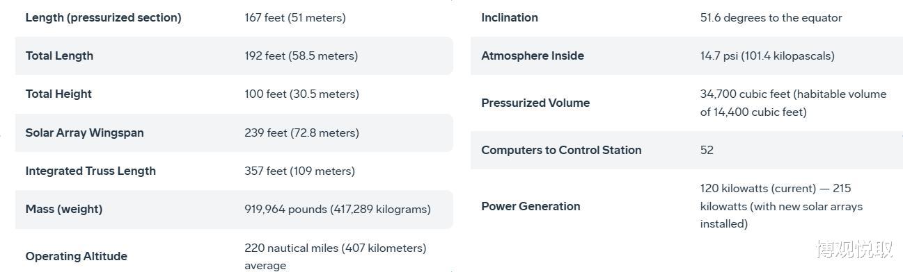规模:总长度192英尺(58.5米),总质量919964磅(约417吨),加压空间34700立方英尺(约983立方米),相当于两架波音747客机的内部空间;
