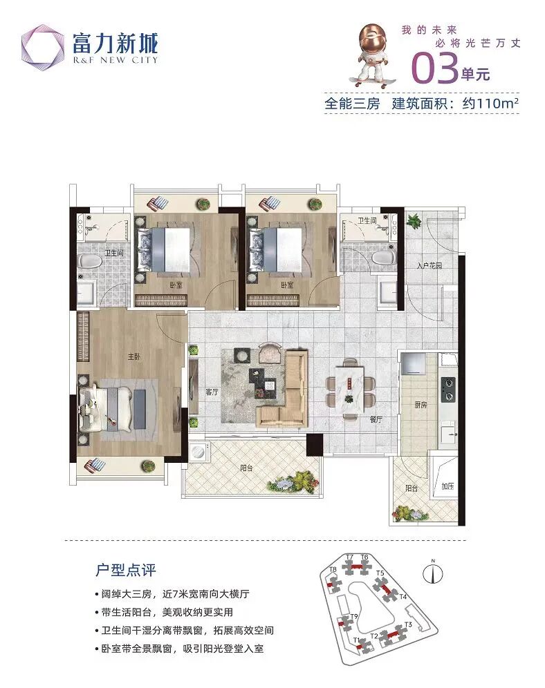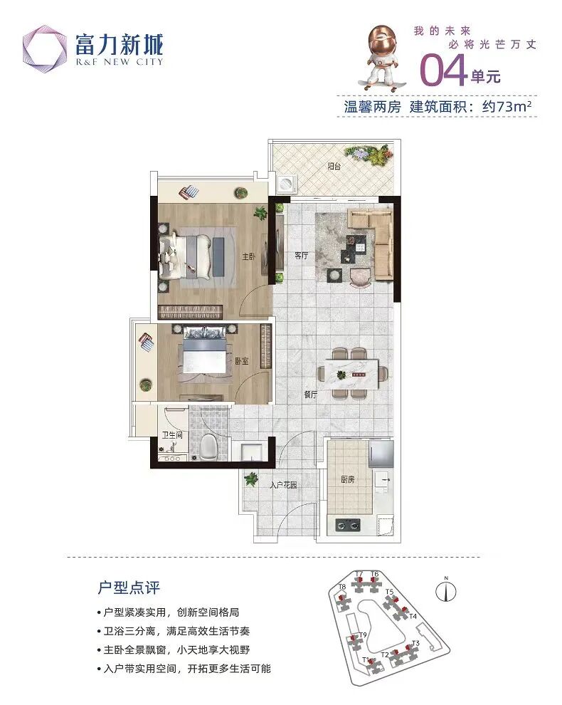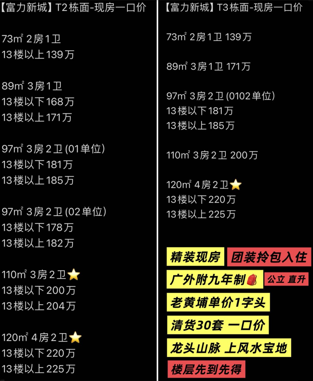 3、是旧规产品,本次一口价单位T2和T3#,都是2023年年中收楼的现房,那时广州新规甚至没有出炉。也就是说,富力新城如今在售的,是之前版本的户型!看看下面这些户型图,它的73平还是两房,89平还是一卫,虽说还是正经一手,但确实与新规存在代差。