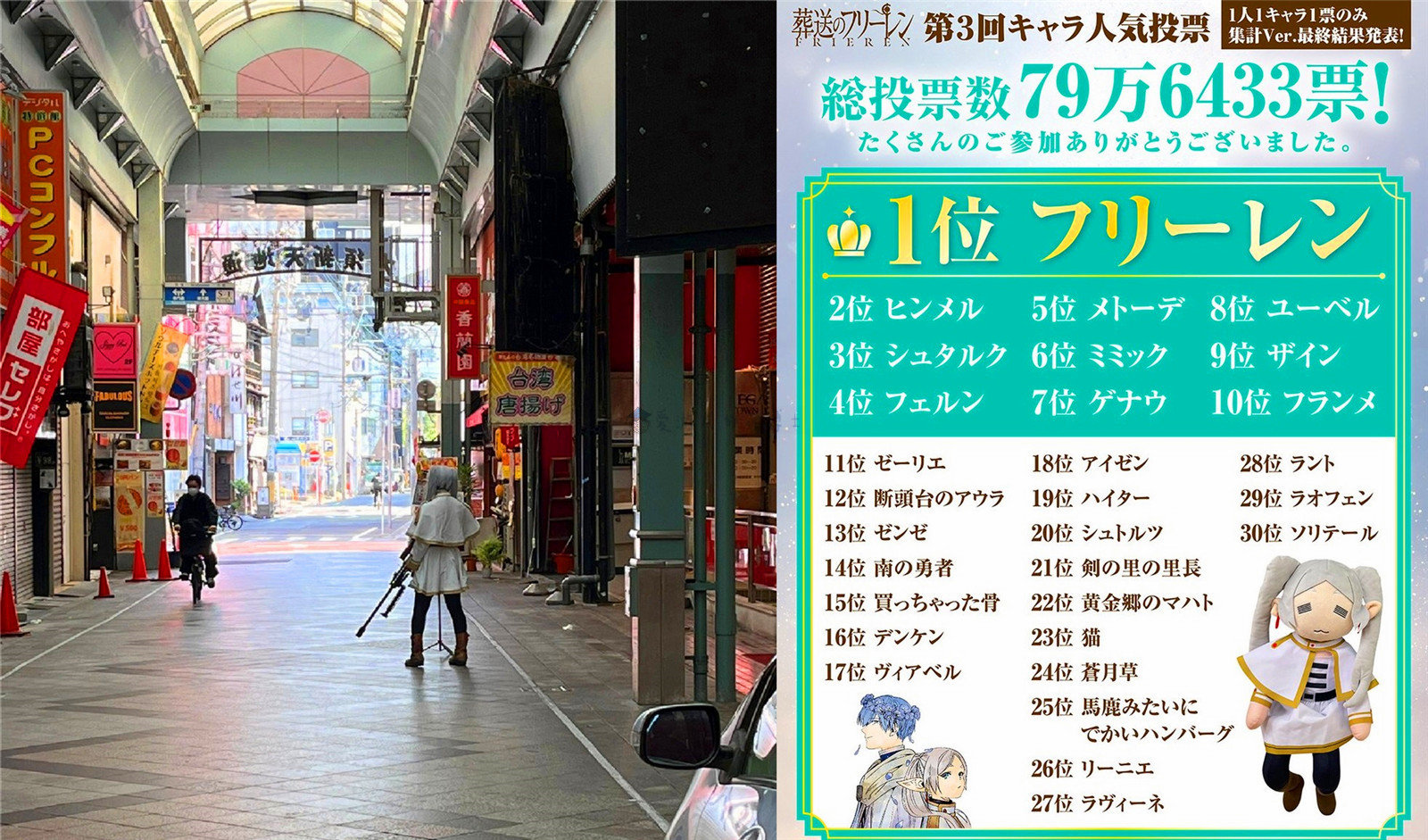 因为这次官方活动采取了无次数限制的灌票规则,最终的排名变动幅度远超以往,许多作品里的核心主要角色排名都没能达到粉丝的预期。为了能给大家提供更贴近真实粉丝喜好的数据,官方后续另行公开了“一人一角色一票”版本的最终排行榜。这份剔除了重复灌票、总票数约为79.6万票的榜单,角色的人气排名回归了大家熟悉的模样,榜单的前10名分别是芙莉莲、辛美尔、修塔尔克、菲伦、梅特黛、宝箱怪、盖纳乌、尤贝尔、赞因、弗兰梅。