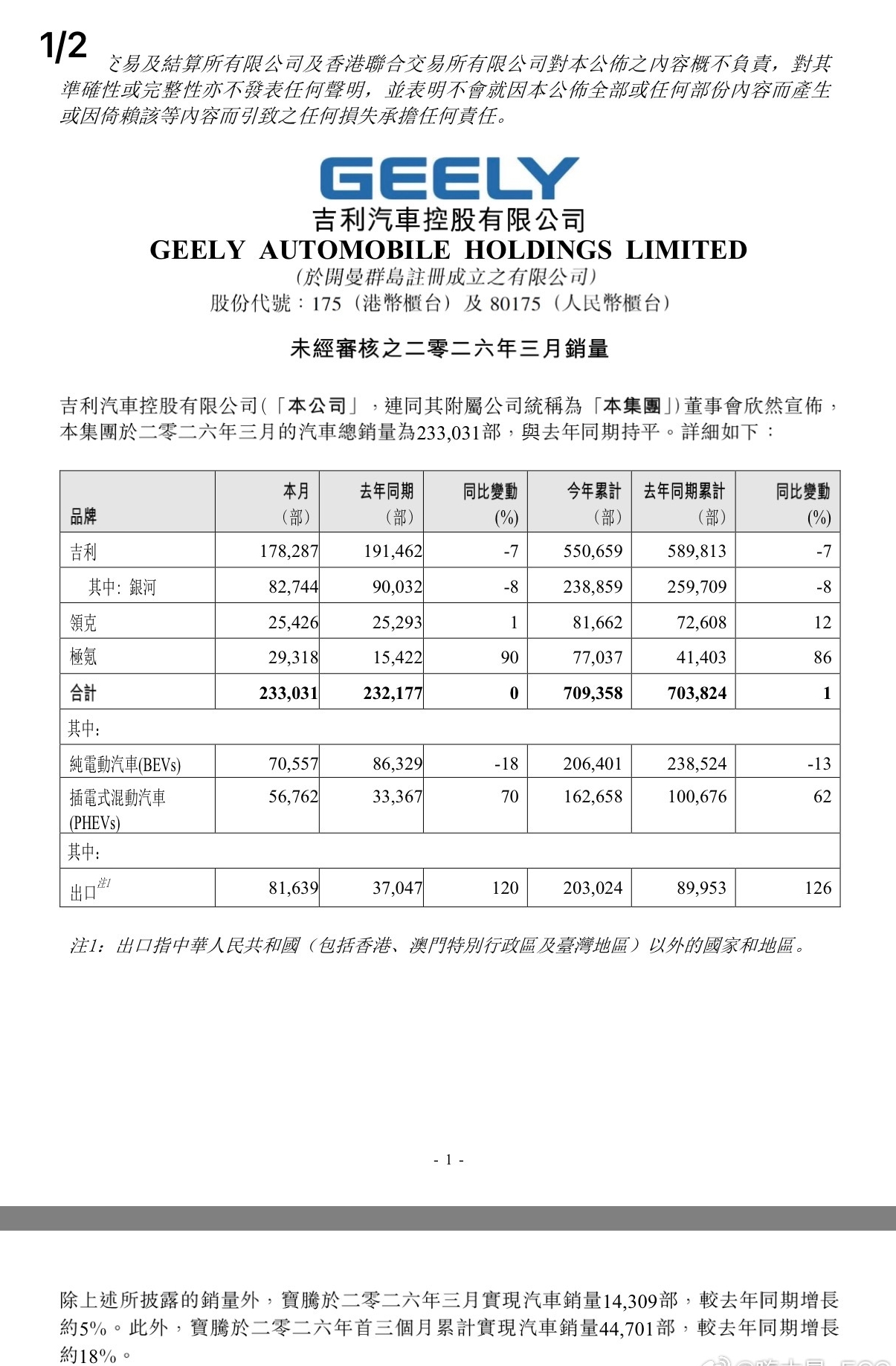吉利汽车:总销量23.3万辆,新能源占比52.03%(12.73万辆);极氪品牌交付2.93万辆,同比大增90.1%。