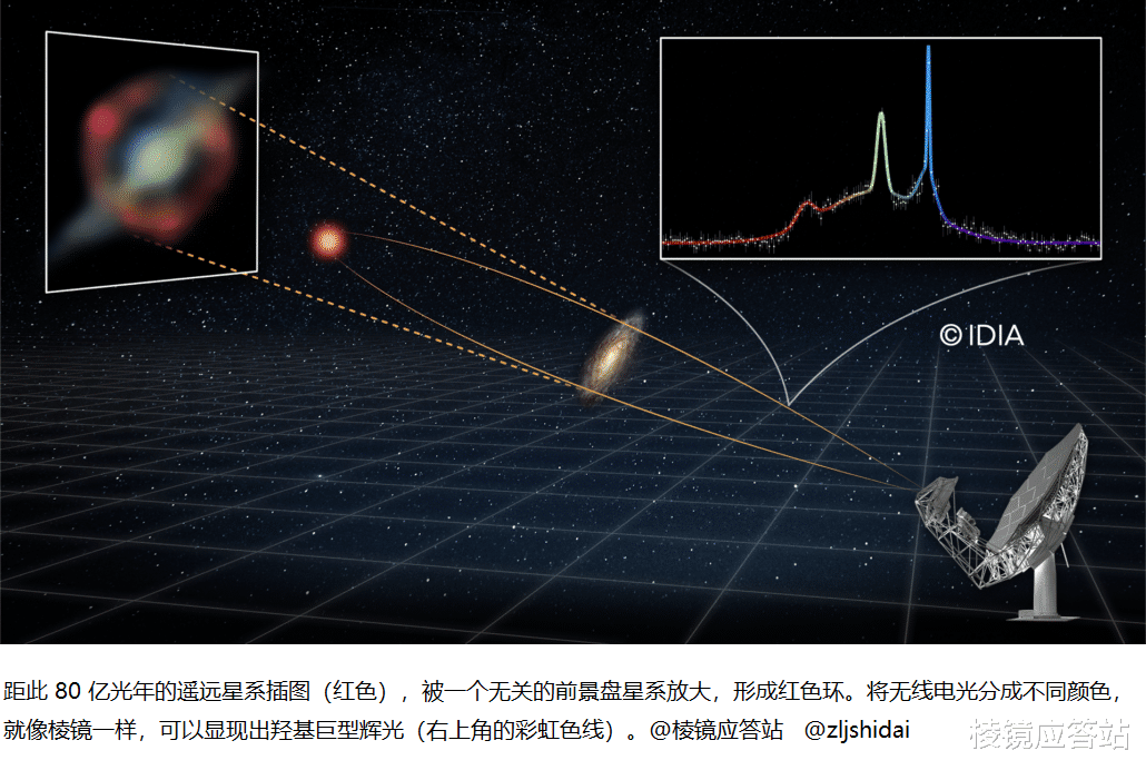 而"天然放大镜",指的是爱因斯坦广义相对论预言的引力透镜效应——光线经过大质量天体附近时会发生弯曲,前景星系充当了"凸透镜",将80亿光年外那道微弱的信号放大到可探测的强度。