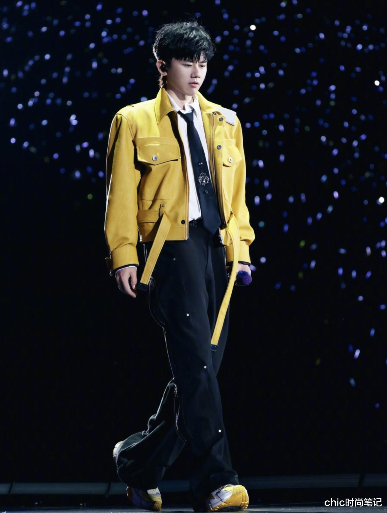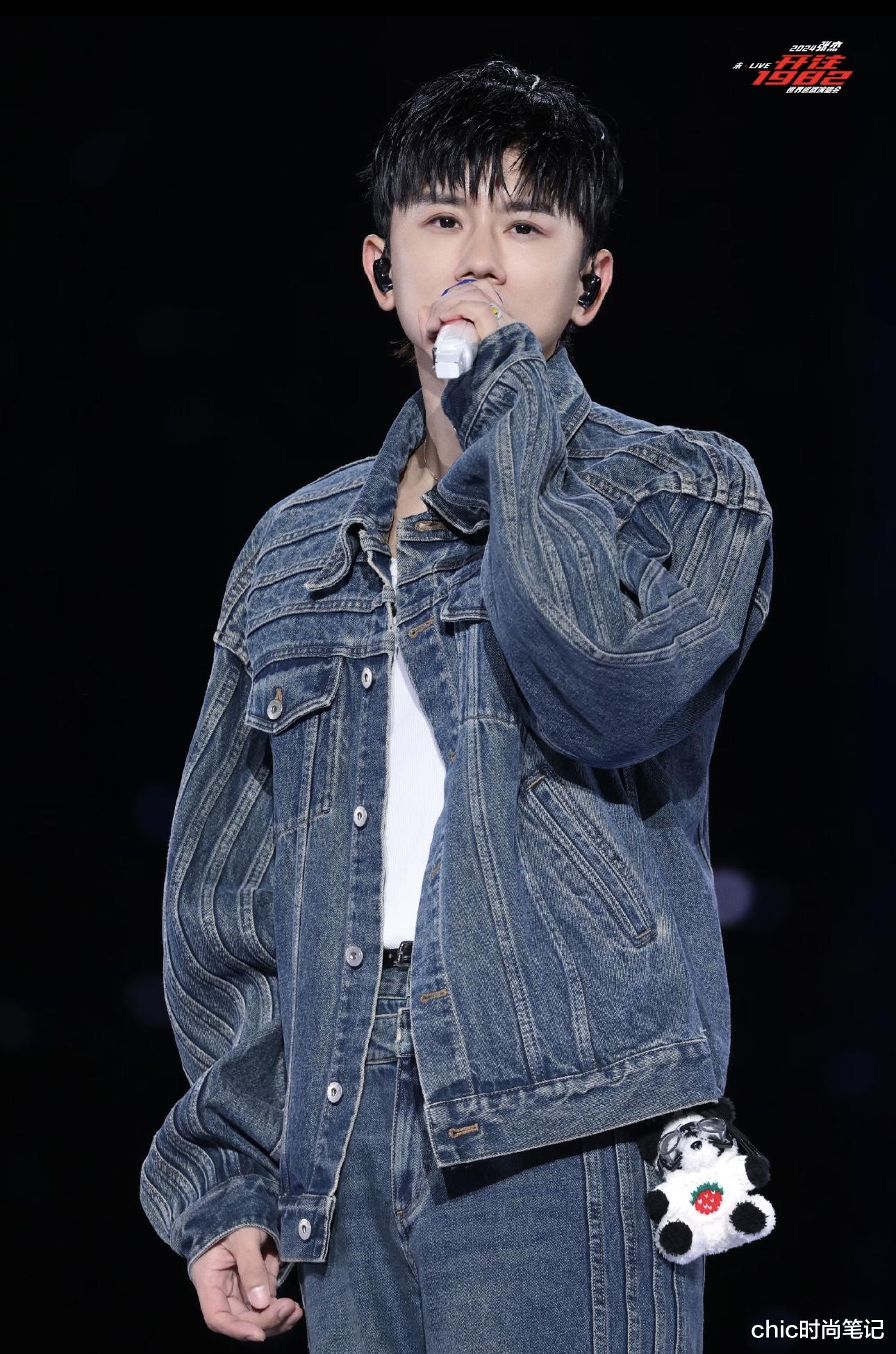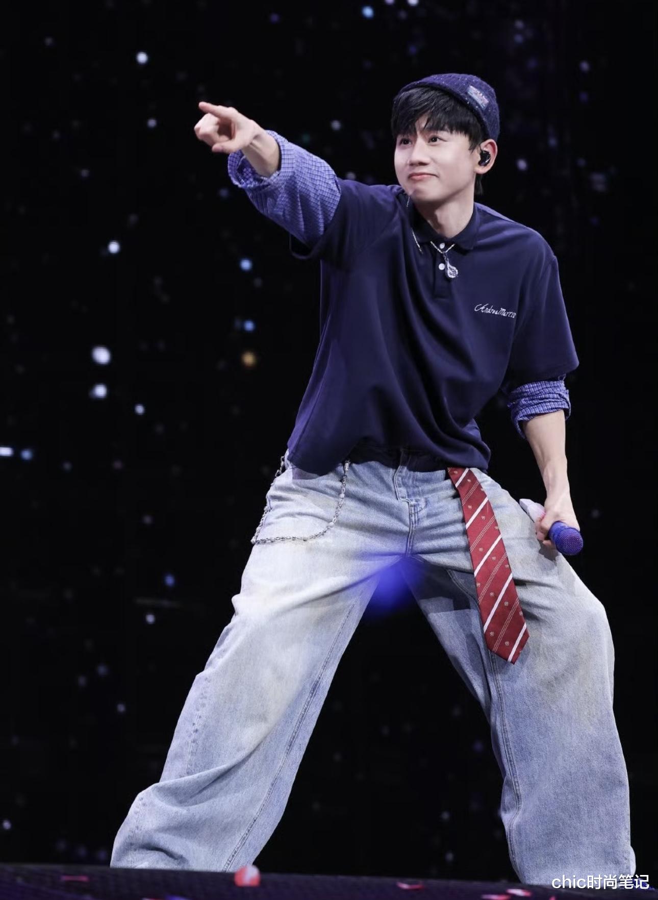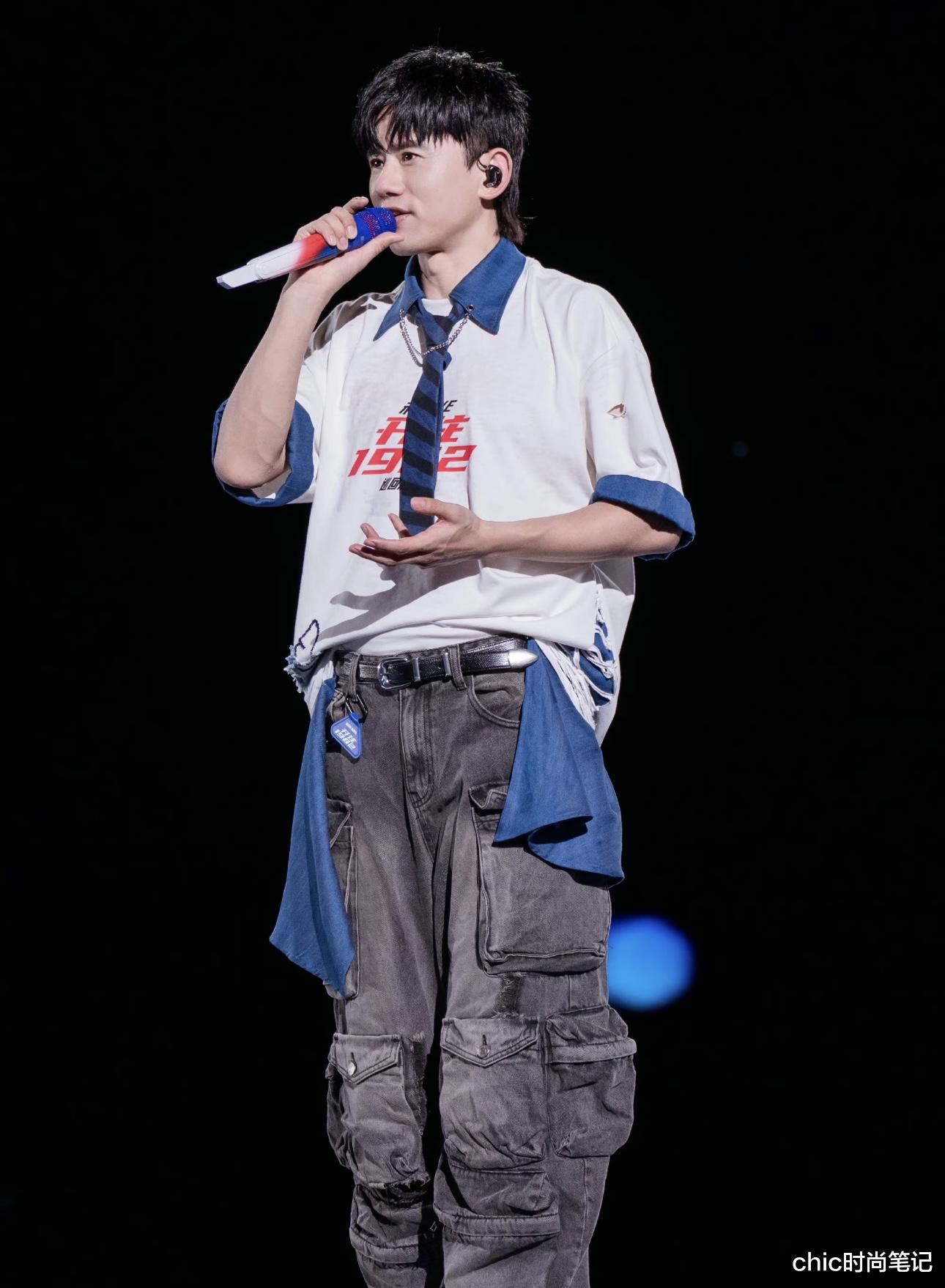 蓝色衬衫+白色大版T恤,下身是做旧款工装牛仔裤,看着就很街头氛围感,T恤上的破洞设计和衬衫的长下摆设计很适合舞台造型。