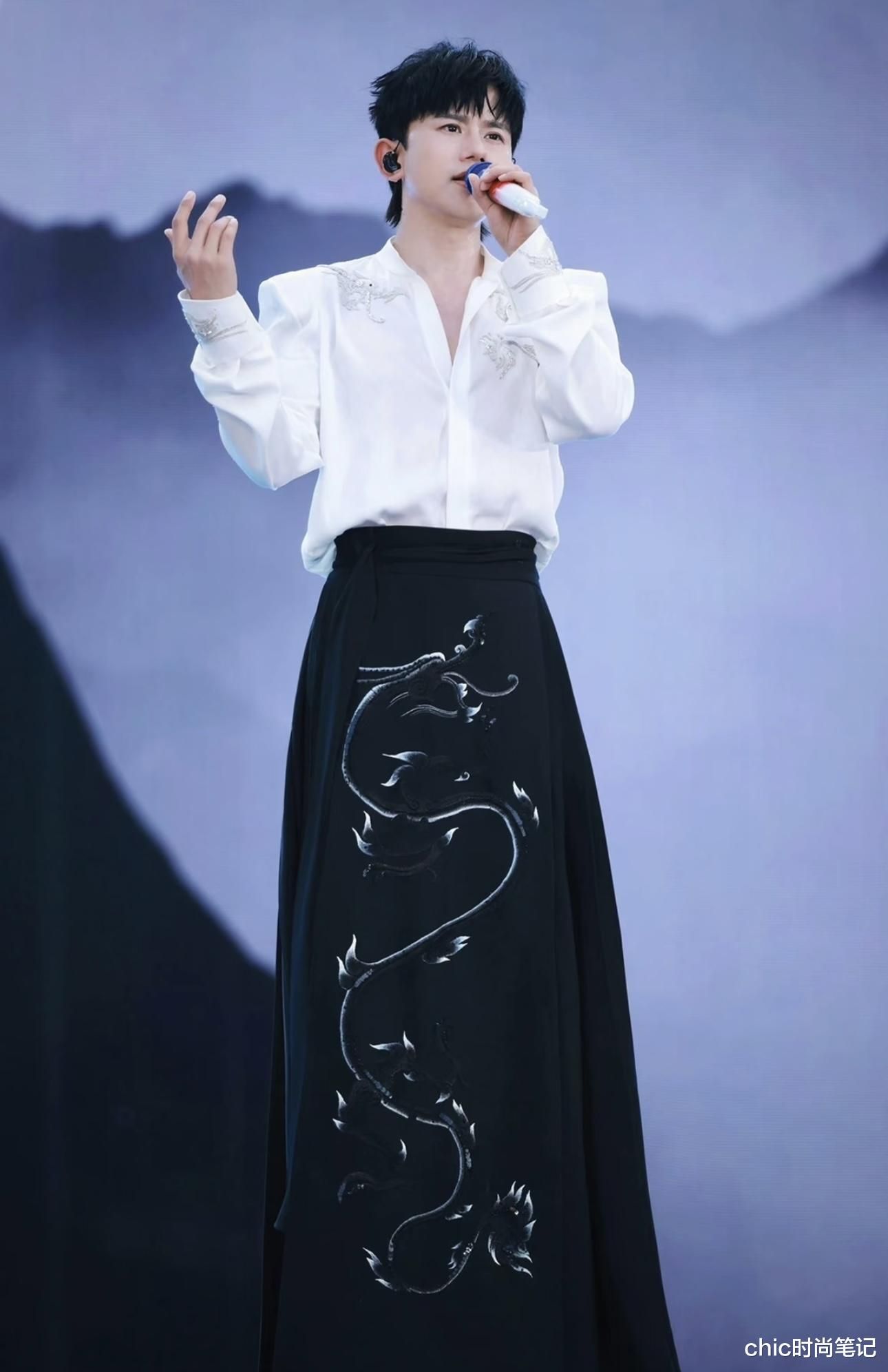 白色立领衬衫上点缀着刺绣,精美而重工,下身是中国传统的马面裙造型,古风小生的儒雅与清冷的氛围感拿捏住了。