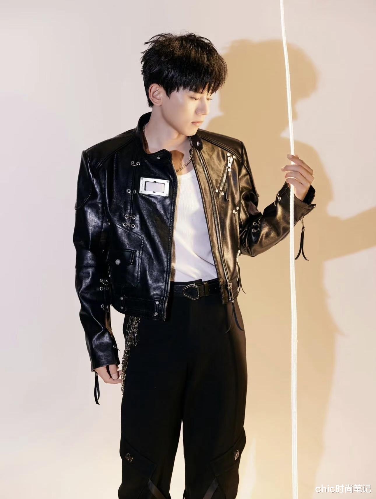 同样也是基础白T打底,外搭质感皮衣,光泽感与质感并存,略短款的设计搭配高腰款裤子,男生的好身材好比例也能轻松穿搭出来。