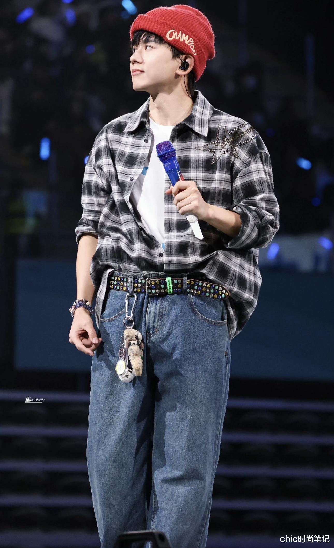 格子蓝衬衫搭配深蓝色卫衣,下身选择一条浅色系阔腿牛仔裤,一顶蓝色系毛线帽俏皮感和少年感俱佳,也与张杰自己的应援色--蓝色相呼应了。
