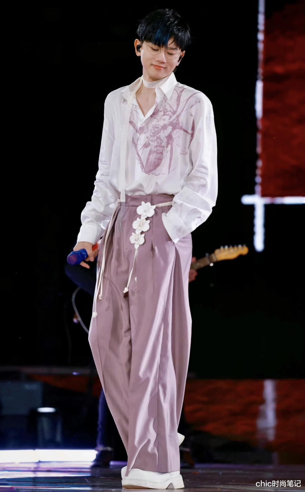 白色中国风衬衫,慵懒感十足,下身是皮粉色的阔腿西裤,腰间佩戴的花朵腰带让整体的造型更加松弛和随性,翩翩少年。