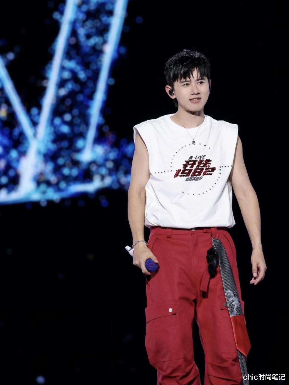 白色无袖T恤上印有演唱会tag,下身搭配的是红色工装裤,作为时尚点缀,腰间挂着红色领带,让穿搭更有层次感。