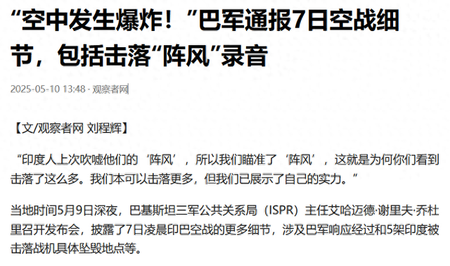 实锤了!5月9日深夜,巴基斯坦军方高官,披露了印巴双方5月7日空战的细节,巴方不仅标注了印度战机坠落的地点,还公布了一段阵风战机编队的通话录音,显示巴方确实以0:6的战绩,击落了6架印度战机,包括3架阵风,取得了空战的大胜!