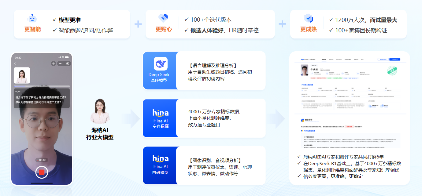 •AI面试量最大:海纳AI服务了5000多家企业客户,其中包括100多家500强集团,累计面试超1200万人次,在快递、制造、零售、餐饮等行业沉淀了1000+岗位模型。