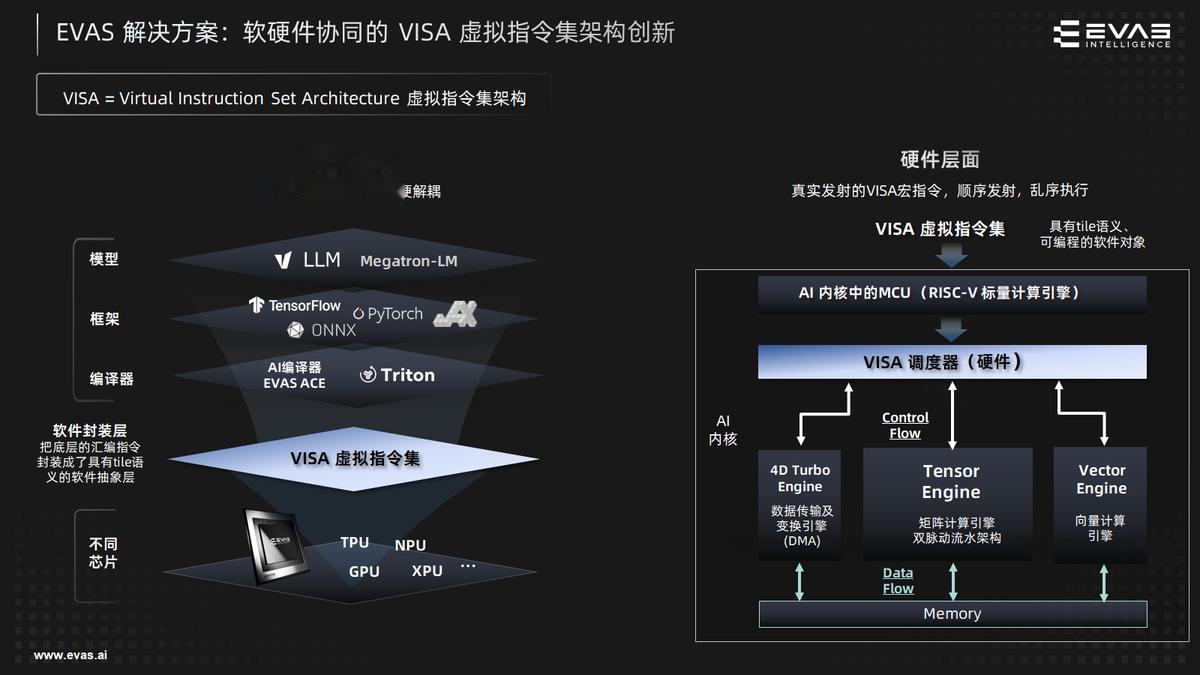 为了提升开发人员基于奕行智能AI芯片部署AI大模型的效率,奕行智能以独创的虚拟指令(VISA)技术在软件与硬件之间建立中间抽象层,上层的算子及AI编译器建立在VISA之上,而硬件则负责VISA宏指令的执行。这一设计巧妙地隔离了硬件迭代对上层软件的冲击,有效解决了芯片升级带来的软件兼容性挑战。同时,VISA通过软流水、循环展开等极致优化,解决了AI计算中高级Tensor操作直接编译到底层指令时性能陡降的行业痼疾。