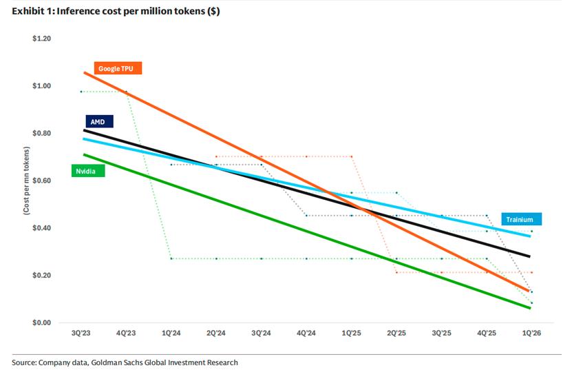 此外,随着大模型进入推理时代,Token成为核心产品形态。与软件近乎零成本复制不同,Token的生产以算力和电力为原料,提升算力利用率与能效,直接等同于降低推理成本、提高毛利率。在此背景下,以谷歌TPU为代表的领域专用AI计算架构(DSA)凭借突出的能效比崛起。高盛最近的一份报告指出,谷歌TPU v6到 TPU v7,每百万 token 的推理成本降低了约70%。