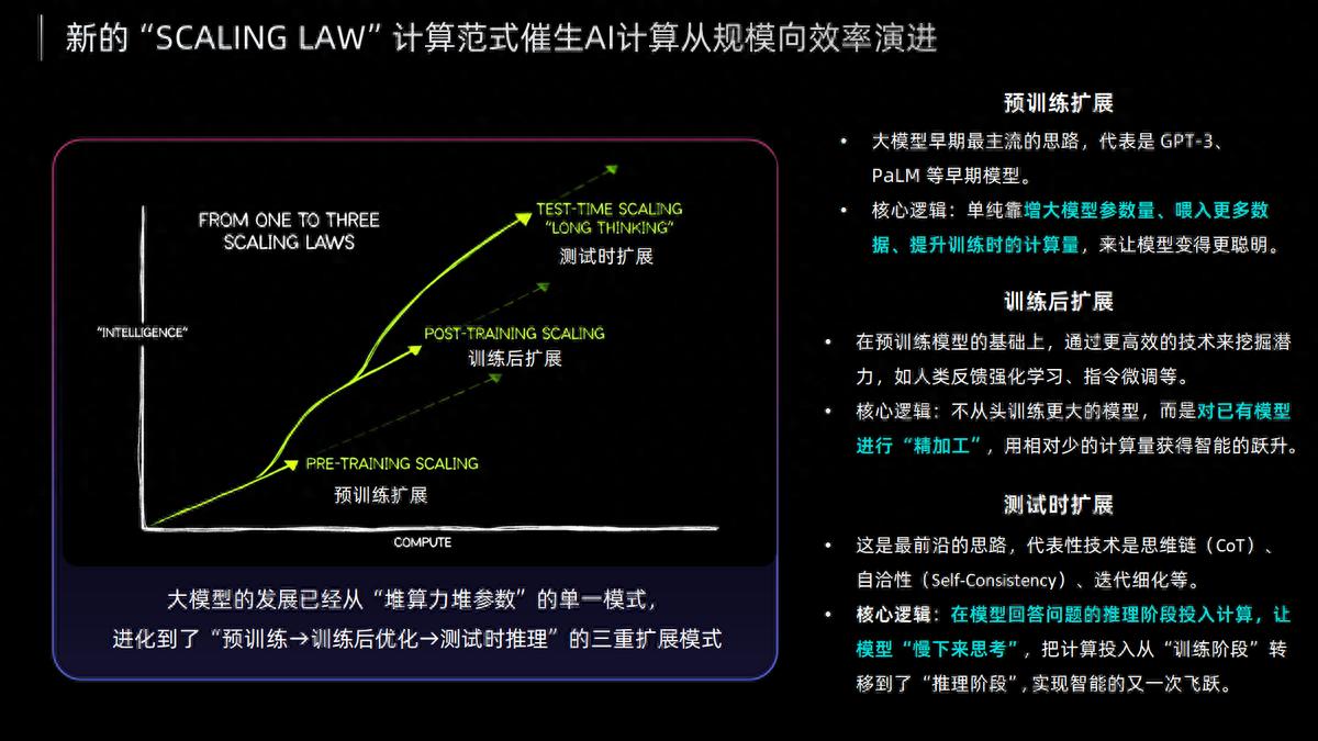 算力困局:从“堆芯片”到“提效能”的必然转向AI大模型的飞速发展,正倒逼算力产业进行一场深刻变革。数据显示,AI模型参数量和训练计算量的增长速度,已远超硬件算力的提升速度,算力供需矛盾日益突出。与此同时,大模型的发展模式也从“预训练主导”演进为“预训练→训练后优化→测试时推理”的三阶段扩展模式,推理需求迎来爆发,推动算力竞争的核心从“规模”转向“效率与规模并重”。
