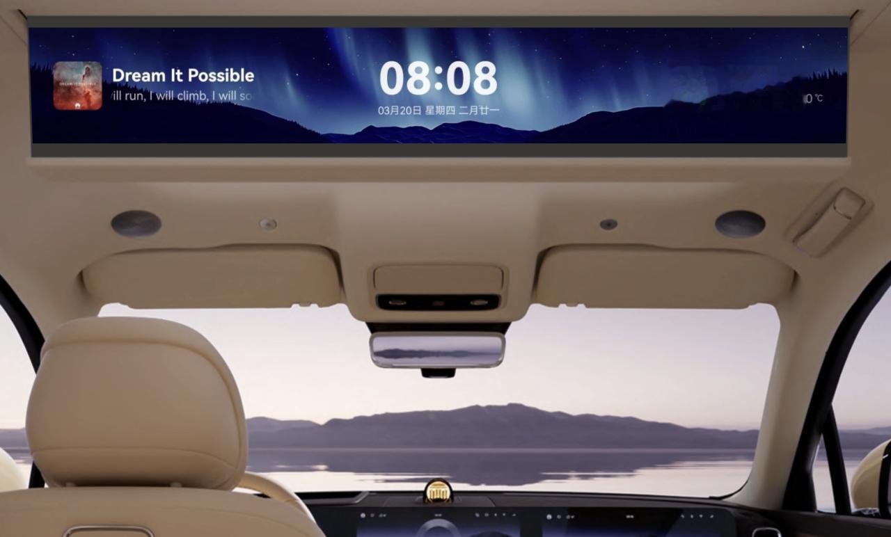 问界M9最大的产品亮点之一,就是它后排有个32英寸的升降式投影幕布,这次改款升级,它也针对这个卖点进行了一系列升级:一是把投影光机升级为隐藏式,进一步解放座舱的头部空间;二是增强投影幕布的画质,让后排乘客有更好的观影体验;三是幕布新增全新的悬停形态,在悬停状态下,可以给后排乘客更多的信息获取窗口。