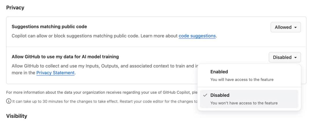 在 Copilot 设置中选择退出模型训练的用户的交互数据