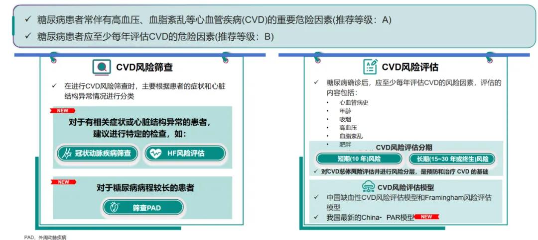 《中国糖尿病防治指南(2024版)》(简称《糖尿病指南2024版》)指出[18],糖尿病患者常伴有高血压、血脂紊乱等CVD重要危险因素,应至少每年评估CVD危险因素(图2)。CVD风险筛查时,依据患者症状和心脏结构异常分类,有相关症状或心脏结构异常者建议做冠状动脉疾病筛查、HF风险评估,糖尿病病程较长者筛查外周动脉疾病(PAD);CVD风险评估方面,糖尿病确诊后至少每年评估,内容含心血管病史、年龄等,要评估短期(10年)和长期(15~30年或终生)风险,对CVD总体风险的评估分层是预防和治疗的基础,评估模型有中国缺血性CVD风险评估模型、Framingham风险评估模型及最新的China-PAR模型。