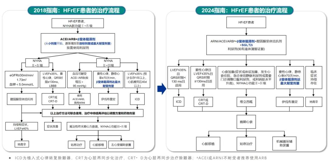 《心衰指南2024》进一步明确了“新四联”方案在慢性射血分数降低的心力衰竭(HFrEF)治疗中的核心地位[13](图3)。推荐以ARNI/ACEI/ARB、β受体阻滞剂、盐皮质激素受体拮抗剂(MRA)及SGLT-2抑制剂为基础的“四联”联合治疗方案;同时强调为实现最大治疗获益,各类药物应逐步滴定至目标剂量或最大耐受剂量,并在治疗过程中密切监测患者的症状、体征、血压、心率、肾功能等临床参数;对于接受“新四联”治疗后仍存在症状或特定指征的患者,可根据个体化情况进一步联合伊伐布雷定、维立西呱、地高辛等药物,或考虑器械治疗以优化预后。