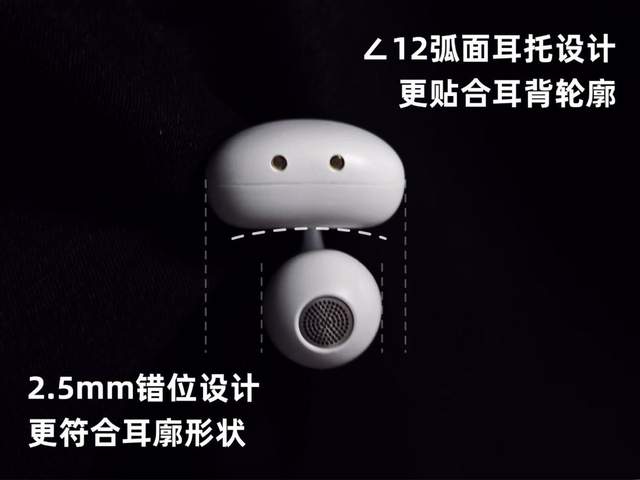 这款耳机采用前高后低的2.5mm错位设计,能更符合耳朵的轮廓,带来更稳固的佩戴体验,怎么甩头都很稳稳地呆在耳朵上,加上12°弧面耳托的结构,能够贴合耳朵曲线,均匀的分散了电池仓的压力,戴起来会更加舒适,搭配4.5g的超轻重量,让佩戴时几乎无感,这种人性化的耳机设计让长时间使用成为一种轻松舒适的体验。