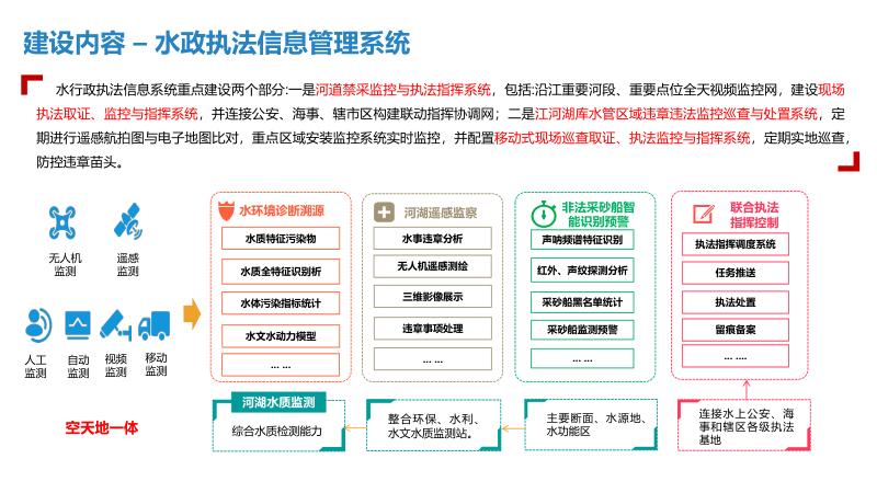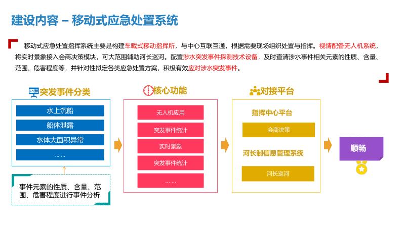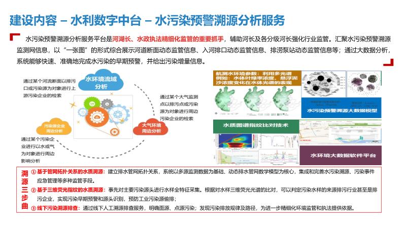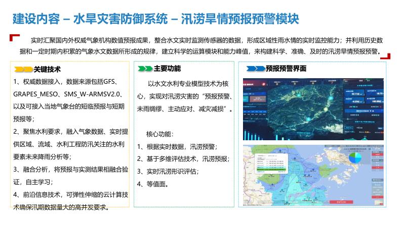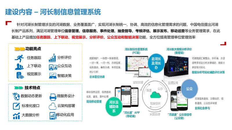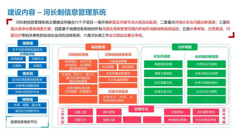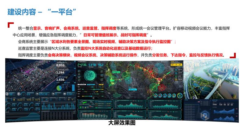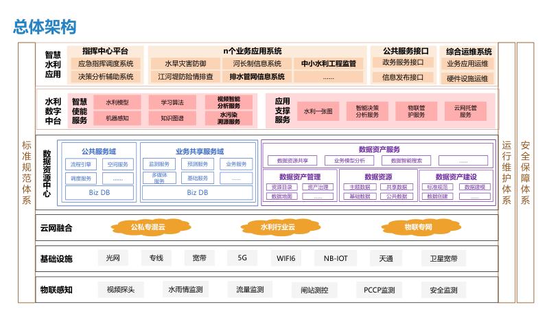 三、建设内容一中心:建设智慧水利大数据资源中心,实现数据汇聚共享,支撑管理决策与应用系统运行。一平台:统一整合显示、音响扩声、会商系统等,形成应急指挥调度平台,提升应急处置能力。N应用:开发水旱灾害防御、河长制信息管理、水行政执法、水事安全预警等系统,实现业务全覆盖。3.1水旱灾害防御:实时监测雨水情、工情,精准调度水资源。3.2河长制信息管理:融合水质监测、生态调度、量化考核等功能。3.3中小水利工程监管:利用信息化手段统一管理水库安全。3.4排水管网信息管理:建立供排水监控体系,实现长效治理。四、技术架构采用物联感知、视频探头、水雨情监测等技术,构建物联专网与水利行业云,支撑智慧水利应用。通过数据智能搜索、公共服务域等,实现数据资产管理与服务大统一。