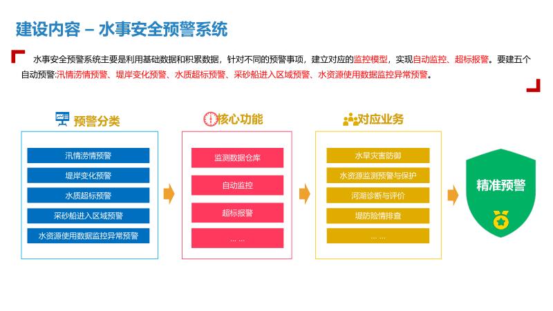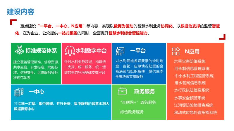构建“一中心一平台N应用”的智慧水利体系,实现水利业务协同化、监管智慧化、服务便捷化。通过信息化手段整合水利设施功能、管理手段及建设目标,打造集“感知、预警、决策、处置”为一体的管理与指挥网络,提升水利工作在经济、社会、生态文明等领域的服务保障能力。