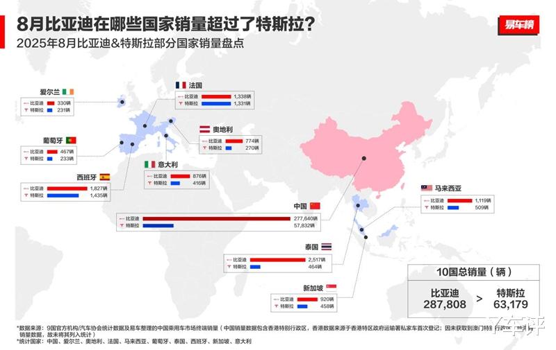 今年1-9月,比亚迪海外销量突破70万辆。据易车数据显示,2025年8月,比亚迪在西班牙、法国、意大利、爱尔兰、葡萄牙、奥地利等欧洲国家,以及新加坡、泰国、马来西亚等东南亚国家,销量均超过了特斯拉。