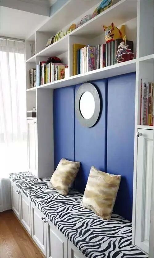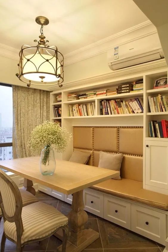 卡座可以结合开放式书柜来设计,随手拿起一本书就可以坐在一边阅读,提供更多方便的同时满足我们的正常需求。