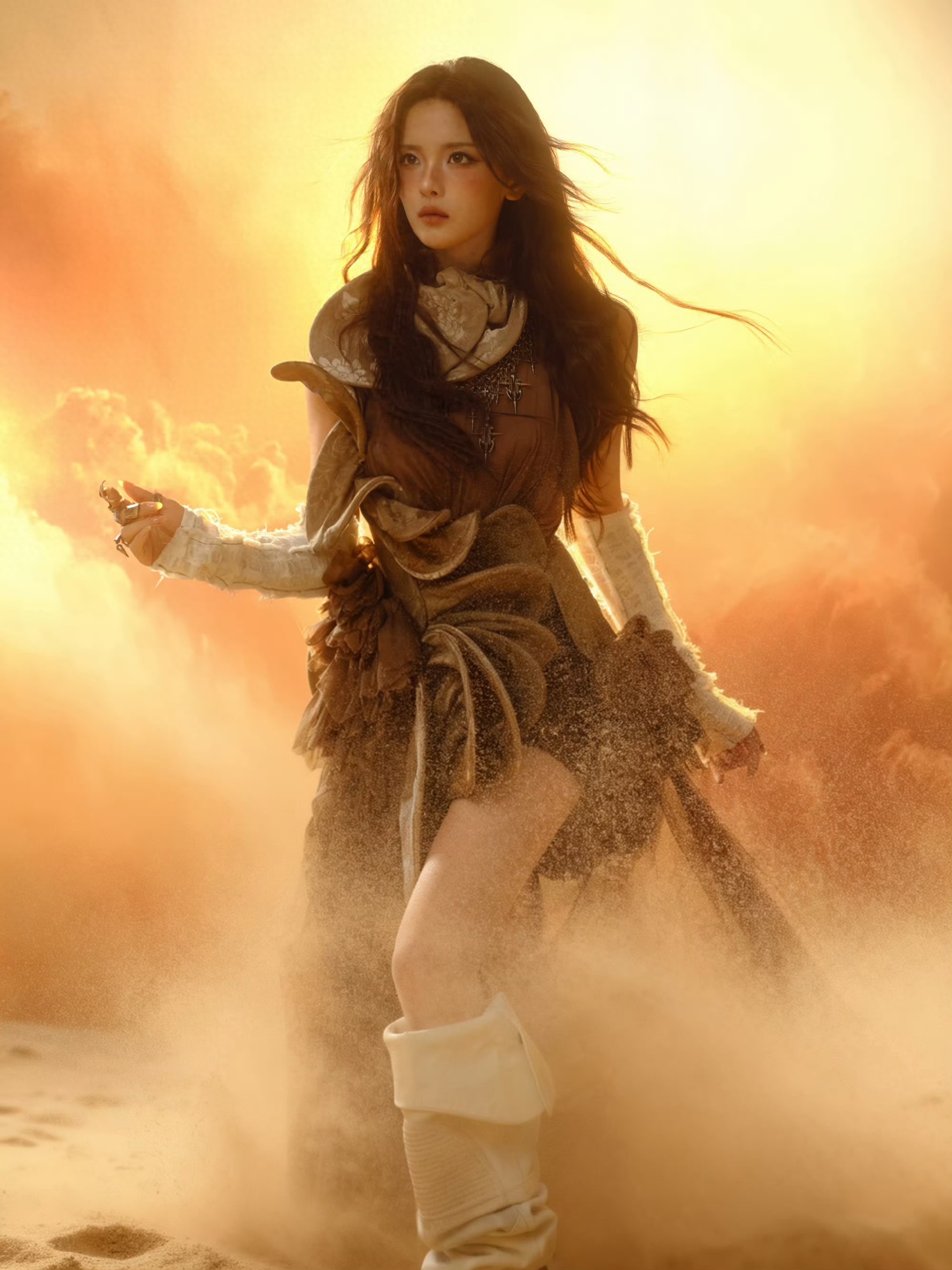 杨超越置身漫天黄沙的荒漠场景,一身做旧感的棕褐废土风穿搭,层叠褶皱的裙摆、绑带设计与做旧配饰,打造出凌厉飒爽的沙漠女战士既视感。