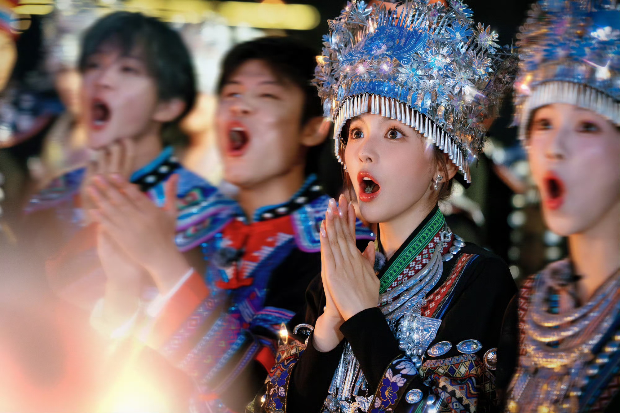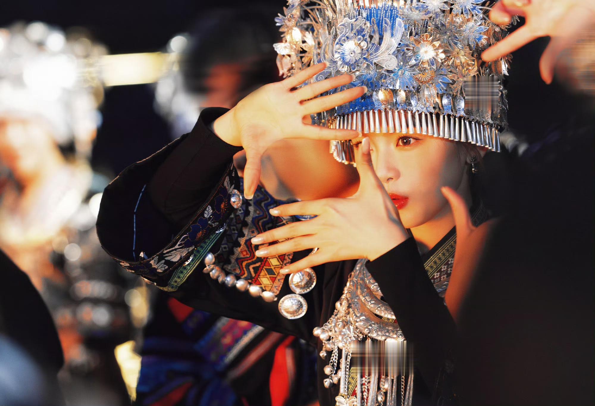 切换为鲜活明媚的民族风造型,一身缀满银饰的传统服饰,繁复的银冠、多层项圈与精致刺绣,衬出民俗纹样的细腻雅致,展现着民族文化的厚重与华丽。