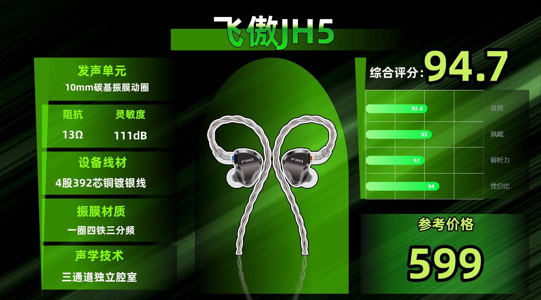 声音部分采用一圈四铁的三分频结构,10mm 碳基振膜负责低频与整体声底。整体调音偏顺滑,人声表现自然、不刺激,是它较为突出的地方,高频不会有明显刺感,也没有刻意拔高的解析取向。背景层次感相对保守,在编曲复杂或乐器密集的曲目中,分离度表现一般,这是它比较明显的短板。配置方面使用 4 股铜镀银线材加液态压铸金属面板提升了一定观感,但细节耐用性一般,加上没有麦克风和线控,功能性偏向纯听音用途。整体来说,JH5 更适合偏好舒适佩戴、耐听声音的用户,对解析和做工细节要求不高的话,它依然算是一款好上手的选择。