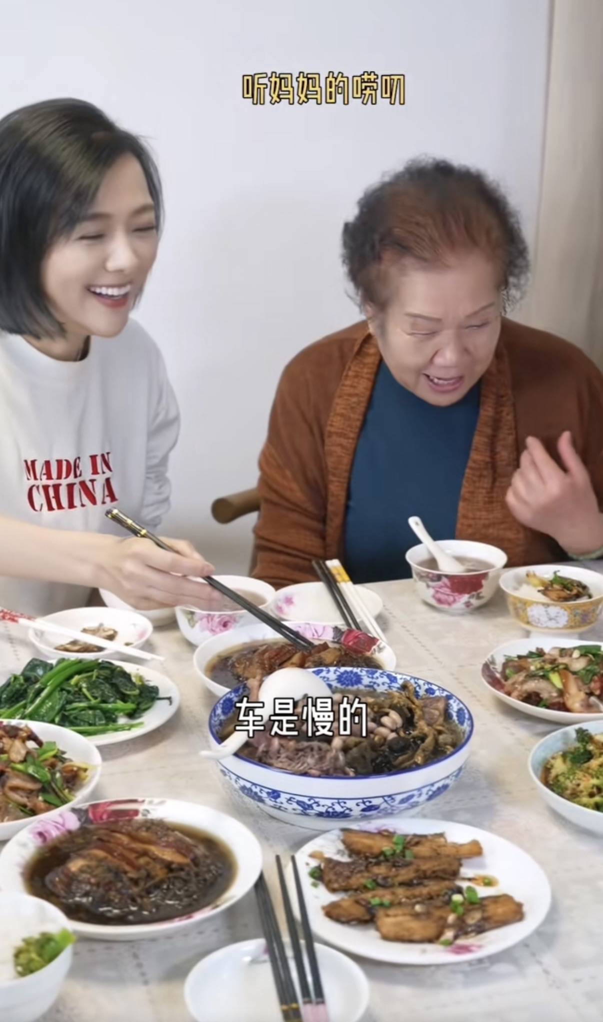 在杨乐乐的镜头下,看到了她慈祥的母亲。乐乐妈烫了一头微卷的头发,连眉毛也是纹过的一样,一看就是个精致爱美的老太太,年轻时候的肯定是个大美人。