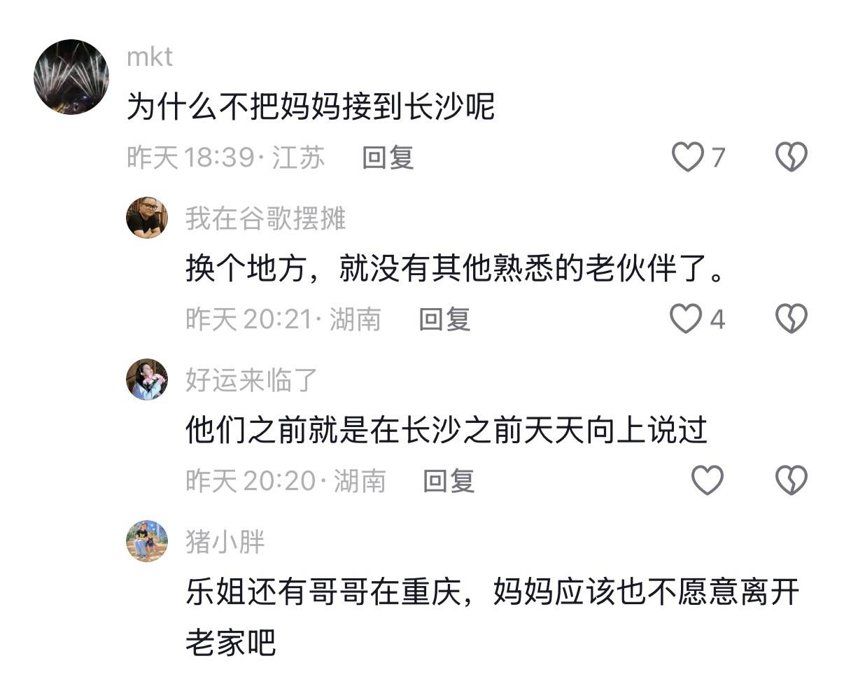 也有网友问,为什么不把妈妈接到长沙呢?其实很多父母都一样,习惯在自己的老家生活,年纪大了、更不想离开故土。而且杨乐乐还有哥哥,也在重庆。