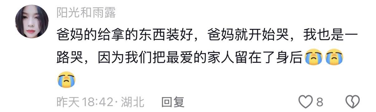 更有网友对这样的画面感同身受,爸妈给拿的东西装好,爸妈就开始哭,自己也是一路哭,离家的心总是痛苦的。