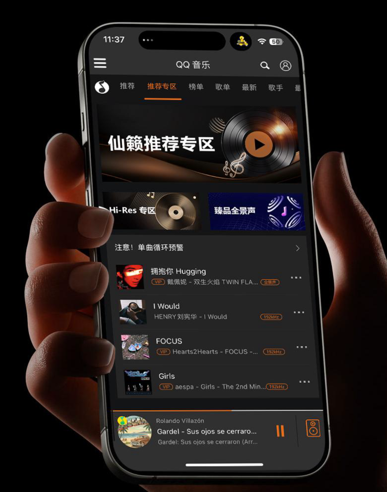 QQ音乐母带臻音、TIDAL等直接采用内嵌模式,会员资格可实现平台母带音乐的192KHz浩瀚输出,流媒体的玩法瞬间HIFI起来,媲美,甚至超越很多本地音乐母带文件音质,即点即播,丝滑无比。