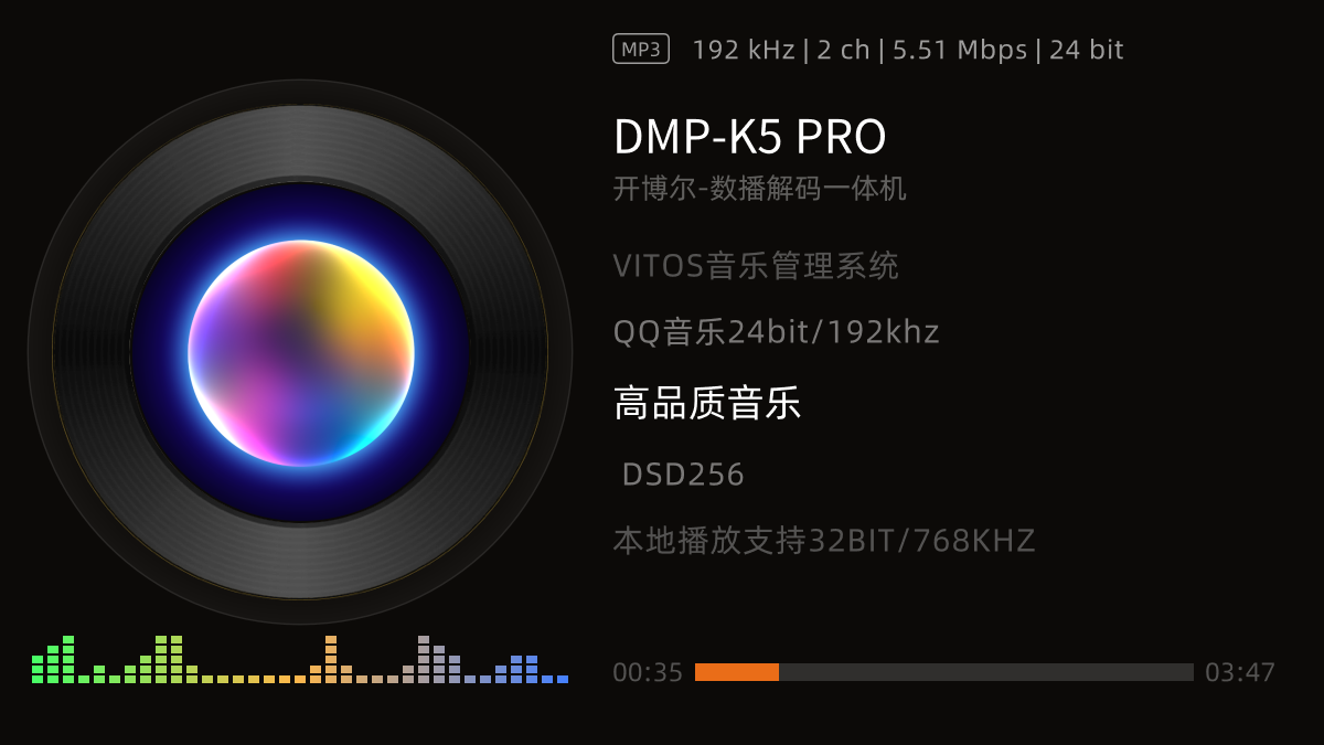 以上亮点或许还不算真正的强大,而DMP-K5 PRO真正强大的点在于——神速开机及超快的交互反应!玩家开机等待仅需数秒,移动端VitOS操控HiFi生态几乎无可感知的延迟,聆听音乐成为一气呵成的享受!
