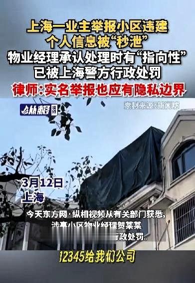 事情发生在上海宝山区一小区,业主邱先生发现楼顶疑似违建,通过12345平台实名举报,本以为官方渠道能守住隐私,没想到信息泄露速度快得惊人。涉事物业经理贺某某事后坦言,投诉信息经12345转至物业后,他只是想“帮忙核实”,联系了被投诉人的儿子,还随口提及投诉人此前就反映过问题,没想到这番操作直接导致举报人信息彻底暴露。目前,贺某某已被警方行政处罚,但这轻飘飘的处罚,根本抚平不了业主心中的恐慌,更堵不上流程里的巨大漏洞。