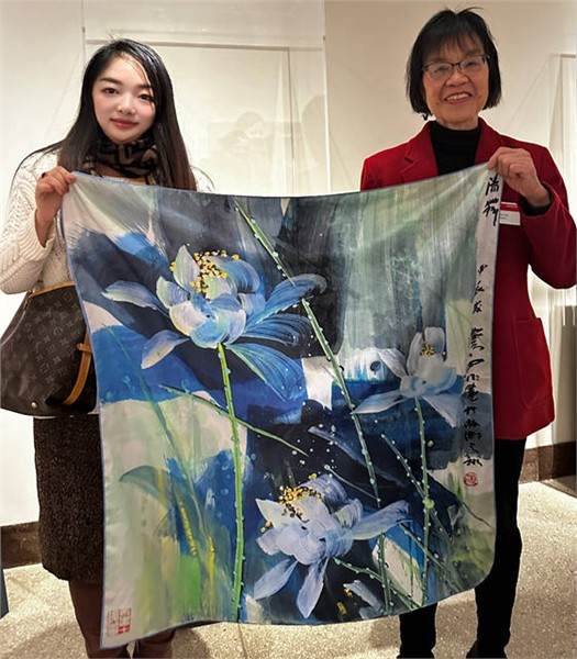 (图为师帅会长向美国国立亚洲艺术博物馆东亚文化研究所赠送湘西书画家雷雨田“中古荷魂”文创丝巾,右为美国国立亚洲艺术博物馆东亚文化研究所资深研究员刘嫄博士)