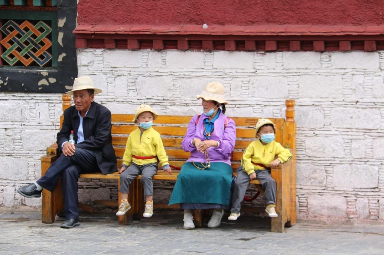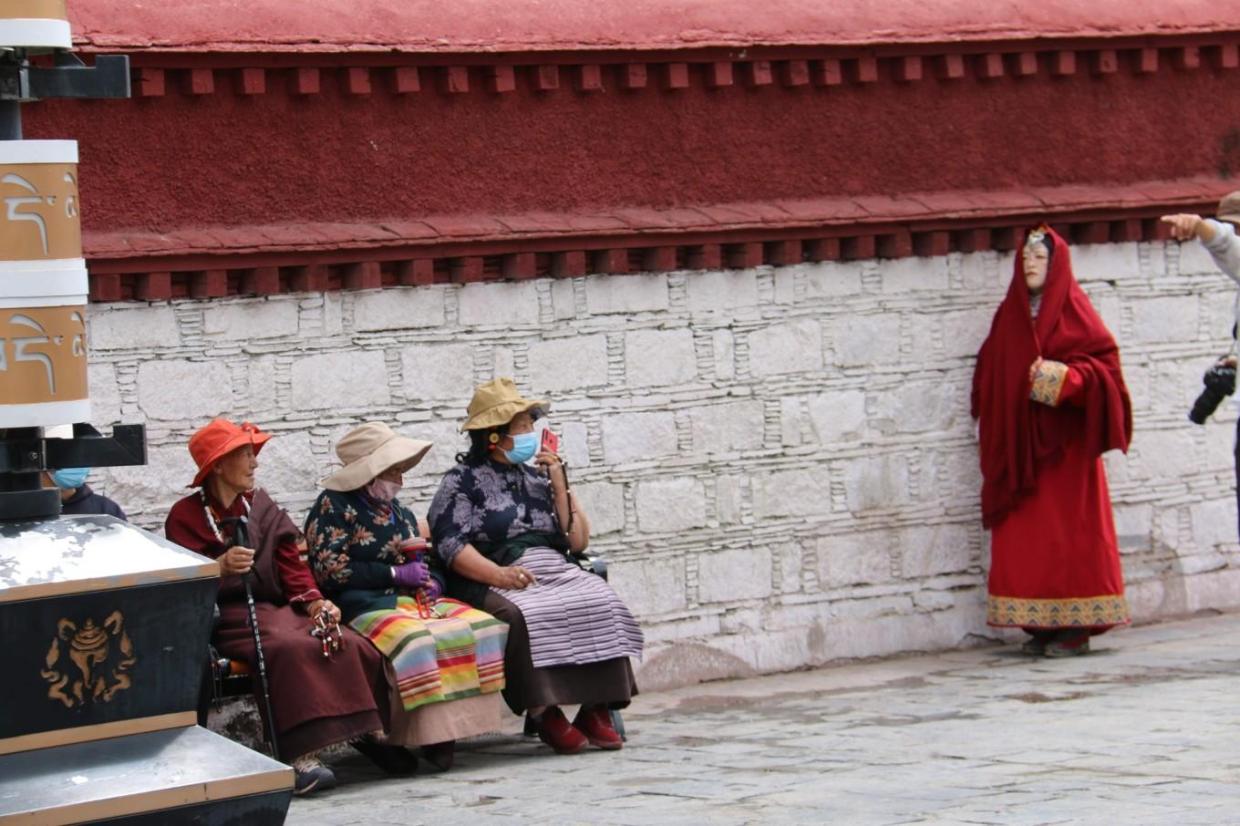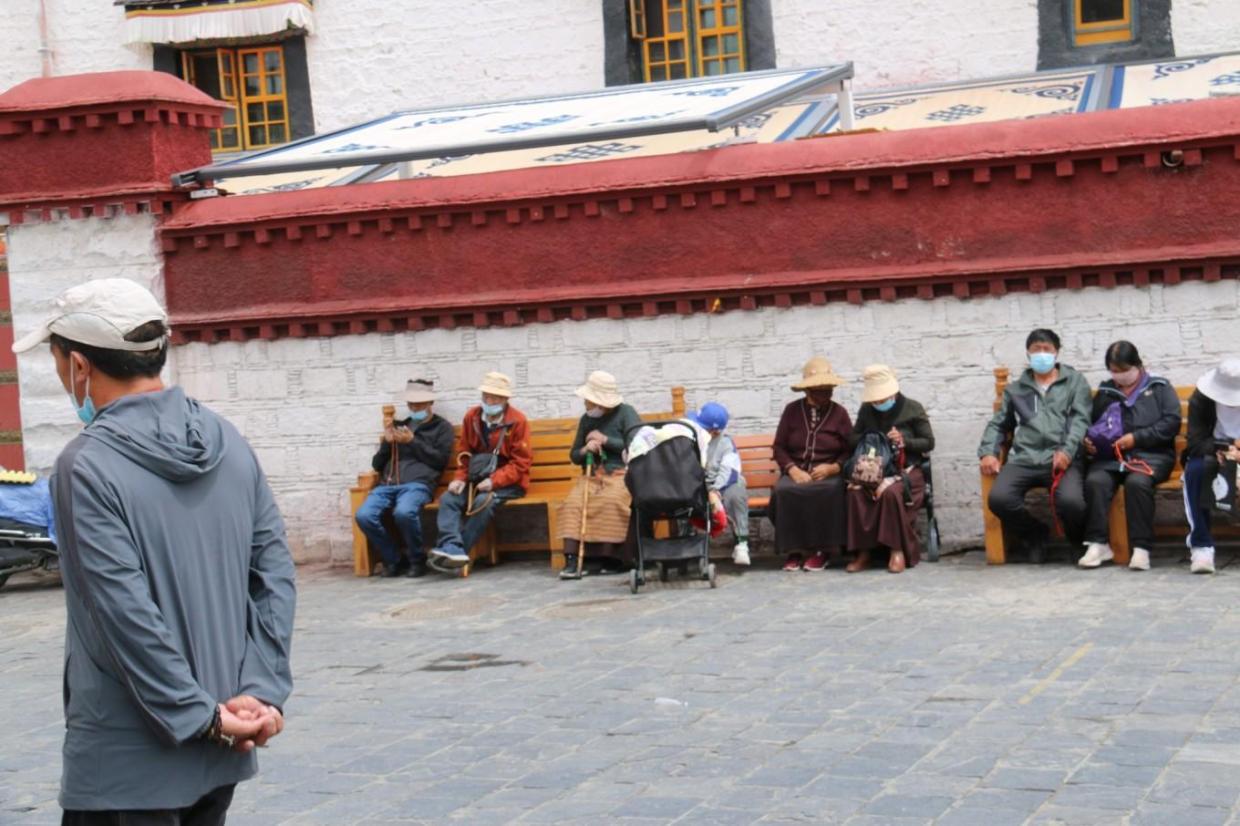 寺院围墙外的长凳上坐着休息的 拉萨 市民,恬静的生活,时时刻刻的沐浴在高原的阳光之下,看着来来往往的游人,早就成为他们的